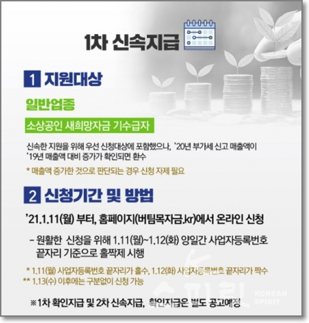버팀목자금은 오는 11일부터 지급된다. 행정정보로 파악된 집합금지・영업제한 업종과 매출감소로 기존에 새희망자금을 받은 소상공인 등은 11일부터 받을 수 있다. 버팀목자금 지원 대상자로 11일 문자를 받고 즉시 신청한다면 이르면 당일 오후, 또는 다음날인 12일 오전에는 받을 수 있다.