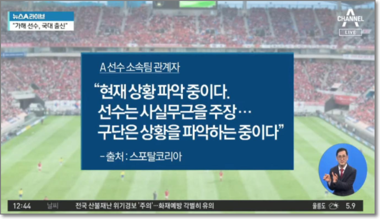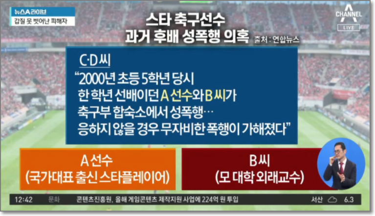 * 가해자 A : 최근 수도권 모 명문구단에 입단한 국가대표 출신 스타플레이어 선수