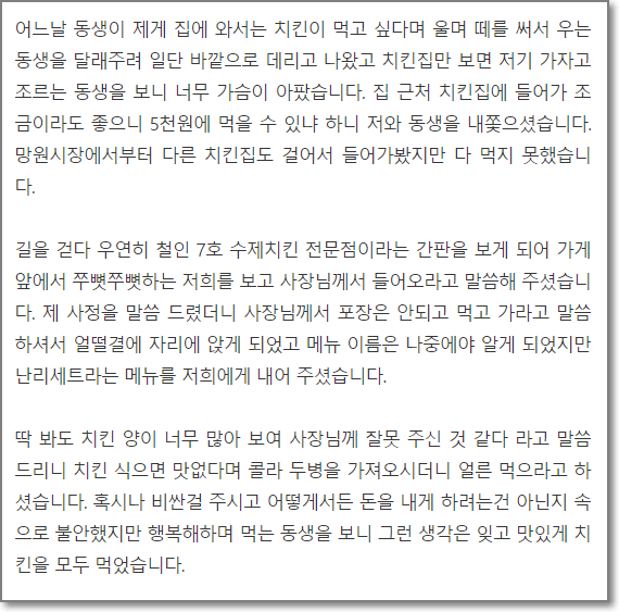 그런데 어느 날 어린 남동생이 치킨이 먹고 싶다고 졸랐다. 하지만 A군의 수중에는 5000원밖에 없었다. A군은 동생을 위해 치킨집에 들어가 “조금이라도 좋으니 5000원에 먹을 수 있냐”고 물었지만 가는 곳마다 문전박대를 당했다.