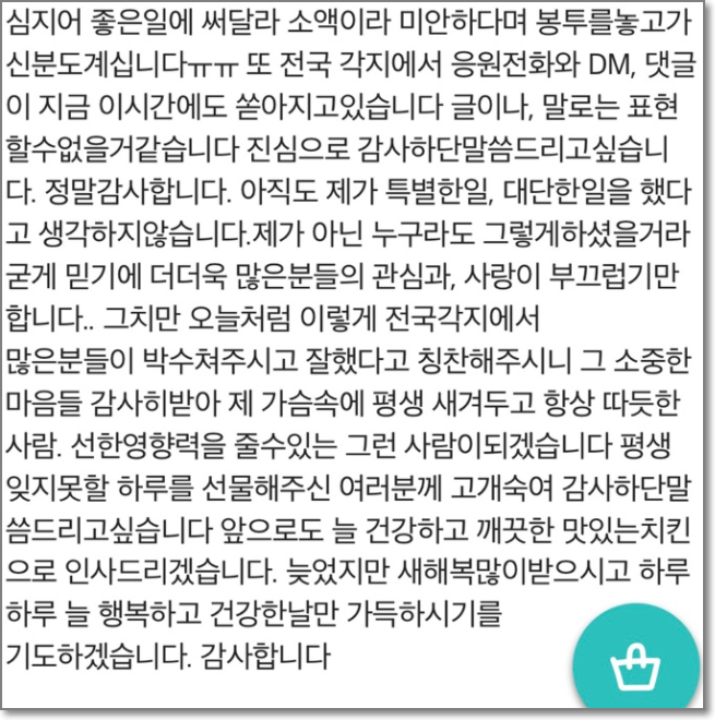 이렇게 뜨거운 반응이 쏟아진 것은 주머니 사정이 어려운 형제에게 박 씨가 치킨을 무료로 대접한 사연이 뒤늦게 알려진 뒤다. 최근 박 씨의 프랜차이즈 업체 본사는 고등학생 A군이 보낸 손 편지를 받고 내용을 공개했는데요.
