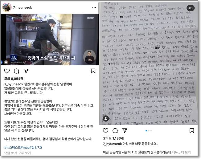 여기서 끝이 아니었다. 프랜차이즈 업체 역시 박 씨에게 1000만원 상당의 월세와 물품 등을 지원하겠다고 약속했다. 김현석 철인7호 대표는 자신의 SNS 계정을 통해 “이런 감동적인 사람이 저희 브랜드의 점주 분이라는 게 너무 자랑스럽고 감사하다”며 “홍대 점주님 선행에 감동받아 영업에 필요한 지원을 해드렸다. 보상받아 마땅하시다”고 썼다. 또한 김 대표는 “A군과 연락이 닿는다면 장학금 전달을 꼭 하고 싶다”는 뜻을 전했다.