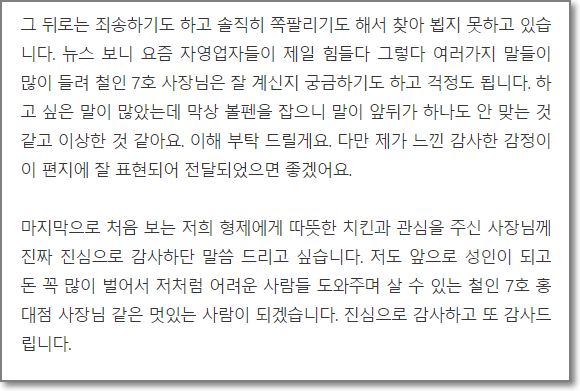 편지에서 A군은 “죄송해서 다음날도 찾아뵙고 계산하려 했지만 오히려 큰소리를 내시며 돈을 받지 않으셨다. 얼마 만에 느껴보는 따뜻함이었는지 1년 가까이 지난 지금도 생생히 기억이 난다”고 밝혔다. 또한 “이후에도 동생이 저 몰래 가게를 찾아가 치킨을 먹었다고 해서 혼냈는데 사장님이 근처 미용실에 데려가 동생 머리까지 깎아 주신 것도 알게 됐다. 진심으로 감사하다. 앞으로 저처럼 어려운 사람들 도와주며 살겠다”고 썼다.