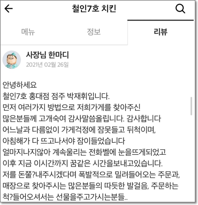 철인 7호 치킨집을 운영하는 박재휘 씨는 지난 26일 배달 앱을 통해 “현재 많은 관심으로 인해 주문 폭주가 이어지고 있다”며 “밀려드는 주문을 다 받자니 100% 품질을 보장할 수 없어서 영업을 잠시 중단한다. 빠른 시간 안에 다시 돌아오겠다”고 밝혔습니다.