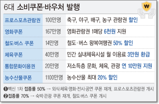 1차 접종률이 50%면 외식·체육·영화·전시·공연 쿠폰을 재개하고 프로스포츠 관람권을 개시한다. 접종률이 70%에 달하면 숙박·관광 쿠폰 및 철도·버스 쿠폰을 발행한다. 정부는 9월 말 이후에는 온·오프라인에서 소비쿠폰 사용이 전면 재개될 것으로 추정했다.