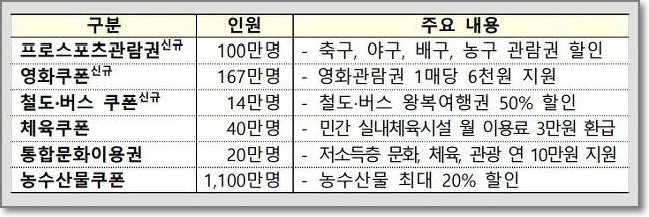 민간 실내체육시설 월 이용료를 3만원 환급해주는 체육쿠폰(40만 명)과 저소득층 문화, 체육, 관광을 일 년에 10만원 지원하는 통합문화이용권(20만 명)도 발행한다. 농수산물을 최대 20% 할인해주는 농수산물 쿠폰은 1100만 명에게 돌아갈 예정이다.