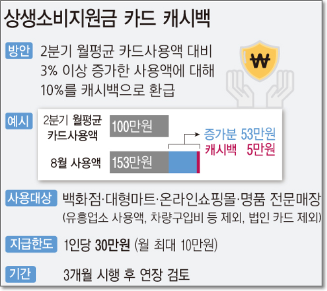 2분기 월평군 카드사용액 대비 3%이상 증가한 카드 사용액의 10%를 다음달부터 3개월간 돌려주는 정책입니다.