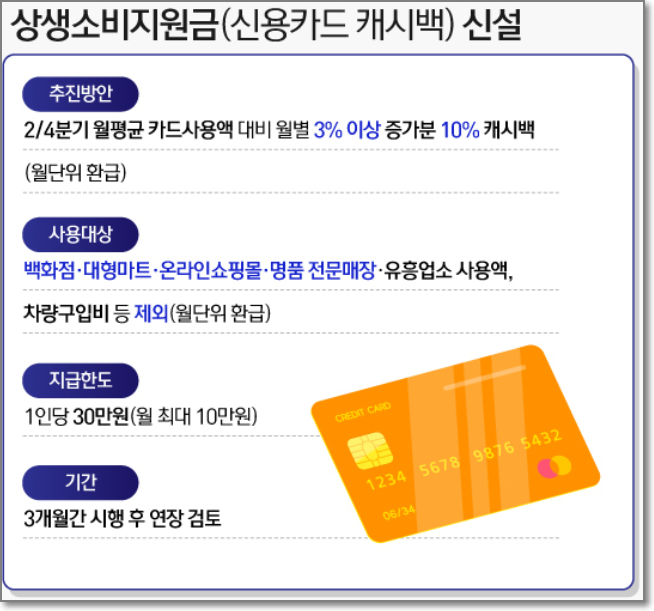 정부는 취약부문에서 보다 적극적인 소비 활동이 이뤄지도록 카드사용액 증가분을 캐시백으로 환급해주는 '상생소비지원금'을 신설한다. 2분기(4~6월) 월평균 카드 사용액보다 3% 이상 증가한 카드 사용액에 대해 다음 달 중 10%를 캐시백으로 환급해주는 방식이다.