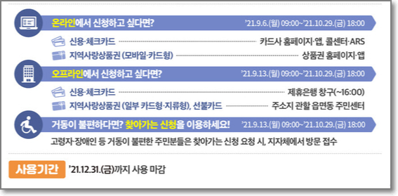 지역사랑상품권 모바일형·카드형으로 국민지원금을 받으려는 사람은 다음 달 6일부터 주소를 관할하는 지역자치단체 지역사랑상품권 홈페이지에서 온라인으로 신청할 수 있다. 다음 달 13일부터는 주소를 관할하는 읍면동 주민센터에 방문하여 신청할 수 있다. 재난지원금은 신청일 다음 날 충전돼 사용할 수 있다. 신청 기간은 오는 10월 29일까지 약 두 달간이다. 신청하지 않은 금액은 국가로 환수한다.