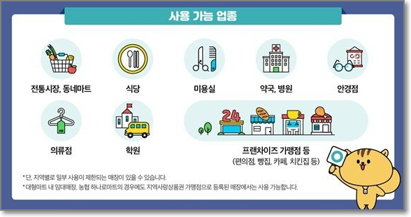 대표적으로 △전통시장 △동네 슈퍼마켓 △식당 △미용실 △약국 △안경점 △의류점 △학원 △병원 △프랜차이즈 가맹점(편의점, 빵집, 카페, 치킨집 등) 등에서 사용할 수 있습니다.