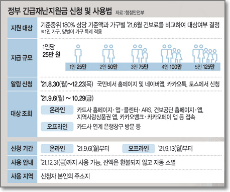 재난지원금은 신용카드 및 체크카드 충전·지역사랑상품권·선불카드 중 선택하여 신청할 수 있다. 2002년 12월 31일 이전 출생자는 개인별로 신청하여야 하고, 개인별로 지급받는다. 다만 미성년자는 주민등록 세대주가 신청하고 받는다. 신용·체크카드로 사용을 원하는 사람은 다음 달 6일부터 본인이 사용하는 카드사의 홈페이지 등을 통해 온라인으로 신청할 수 있다. 다음 달 13일부터는 카드와 연계된 은행에서 오프라인 신청도 가능하다.