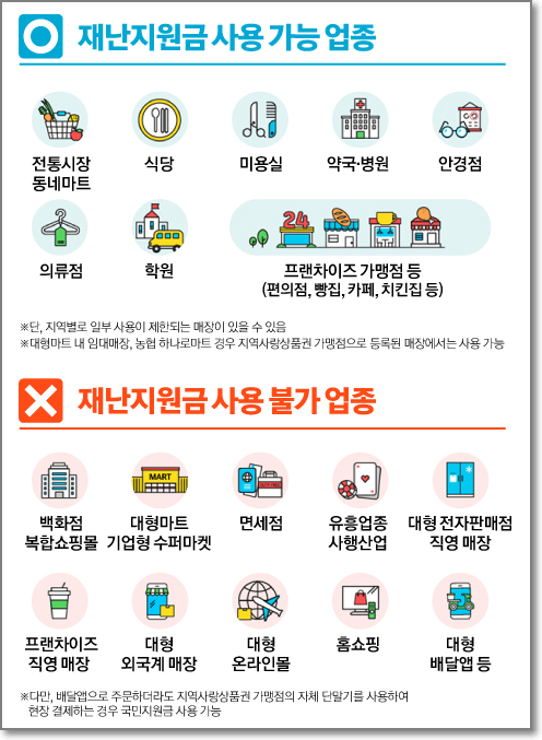 재난지원금은 자신 주소가 있는 지역사랑상품권 가맹점에서만 쓸 수 있다. 전통시장·동네 슈퍼마켓·식당·미용실·약국·안경원·의류점·병원에서 사용할 수 있다. 논란됐던 학원도 지역사랑상품권 가맹점이라면 사용할 수 있다. 프랜차이즈는 본사 직영점이 아닌 가맹점만 사용할 수 있다. 전 매장을 본사에서 직접 운영하는 스타벅스 같은 매장에서는 쓸 수 없다.