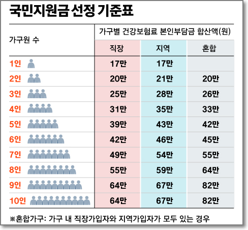 정부는 소득에 따른 건강보험료 산정 방식이 가구마다 다르기 때문에 연 소득으로 한 정확한 지급 기준은 밝힐 수 없다는 입장이다. 다만, 건강보험료율 3.43%를 적용해(직장가입자 세전 월 소득 기준) 추산해 보면 ▶1인 가구 495만원 ▶ 2인 가구 583만원 ▶3인 가구 728만원 ▶4인 가구 903만원 ▶5인 가구 1136만원이다. 다만 보건복지부는 “급여 체계나 가입 형태 여부 등에 따라 다르기 때문에 정확한 선정 기준은 건보료 기준으로 보는 게 정확하다”고 했다