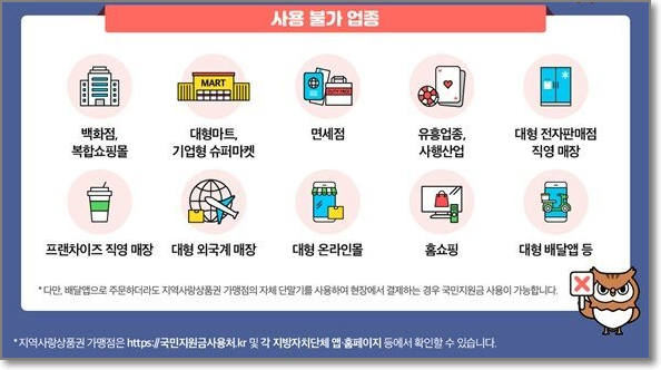 지원금 사용이 불가한 업종으로는 △백화점 △복합쇼핑몰 △대형마트 △기업형 슈퍼마켓 △면세점 △유흥업종 △사행산업 △대형 전자판매점 직영 매장 △프랜차이즈 직영 매장 △대형 외국계 매장 △대형 온라인몰 △홈쇼핑 △대형 배달 앱 등이다.
