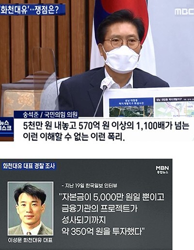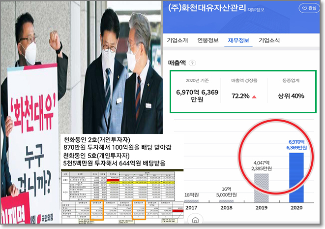 국민의힘은 화천대유가 자본금 5천만원인데 무려 1천배가 넘는 570억을 벌었다고 주장하면서 이게 특혜 비리 없이 가능하냐고 주장합니다.