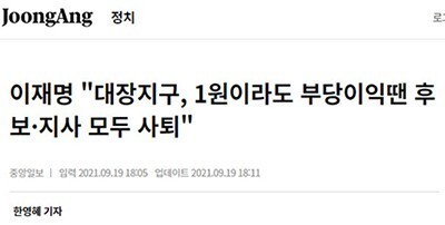 그리고 대장동 개발에서 자신이 부당이득을 취했다면 후보,지사 모두 사퇴한다고 공언하였습니다.